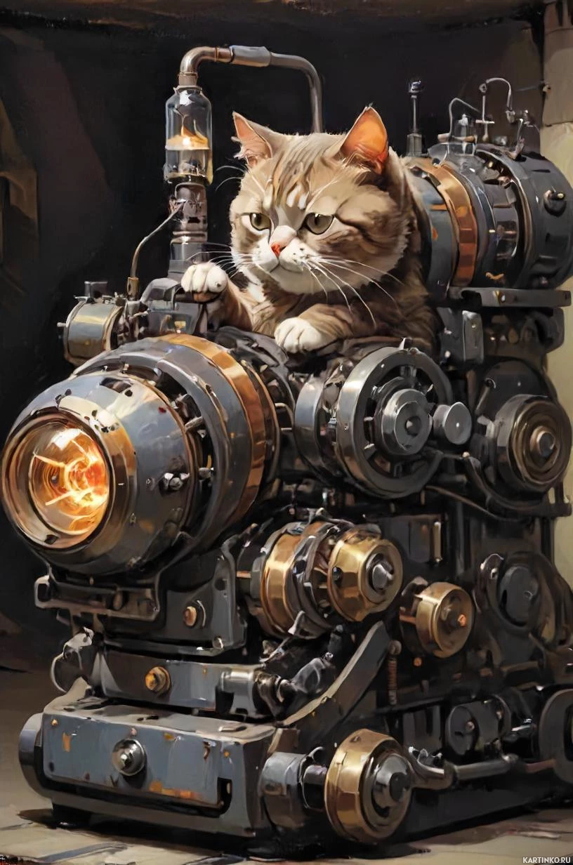 На картинке кот сидит внутри того, что похоже на двигатель или локомотив. Кот повернулся к зрителю, слегка наклонив голову, и его уши торчком. У локомотива два больших цилиндра по бокам, длинный котел посередине и дымовая труба сзади. Также видны приборы или манометры вдоль бортов двигателя. Обстановка намекает на исторический контекст с индустриальными элементами, что может указывать на эпоху, когда паровые двигатели были распространены. Цветовая гамма состоит из приглушенных тонов, что придает картинке состаренный вид.