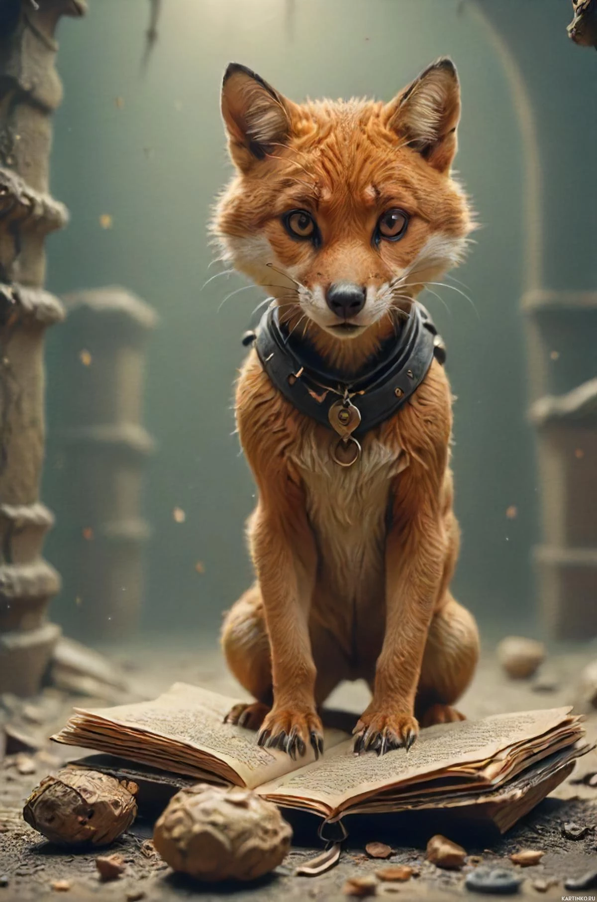 На картинке лиса сидит, внимательно разглядывая читателя. Она расположилась на старой, потрепанной книге, будто замерла в процессе чтения. На заднем плане виднеется полуразрушенное помещение или руины – каменные строения и обломки камней.