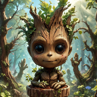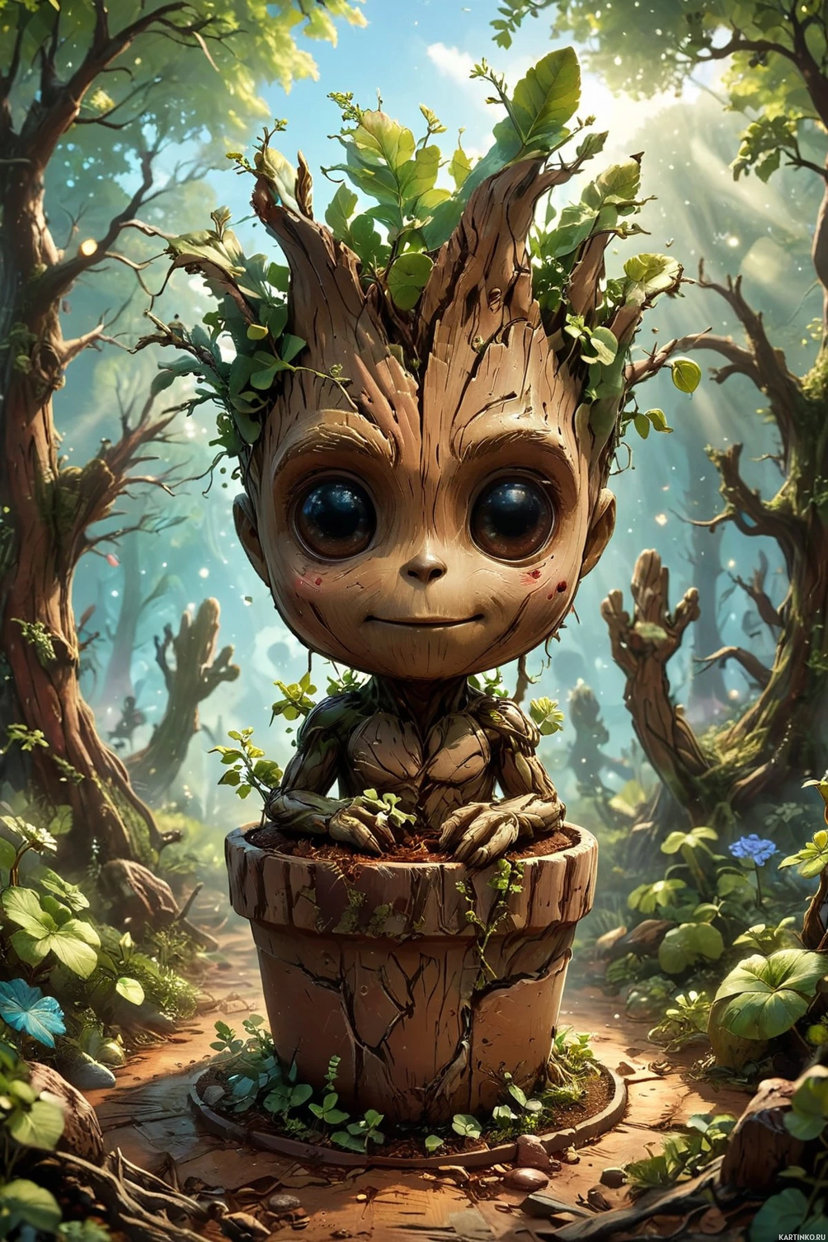lush greenery and is seated in a plant pot. Above the character is a canopy of light blue sky dotted with white clouds, suggesting a whimsical or