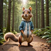 In the image, a cartoon chipmunk stands in a forest setting. The chipmunk is wearing a blue jacket with two white pockets on each side. It has a cheerful expression on its face and is standing upright on its hind legs. The forest around it consists of tall trees that are slightly blurred, suggesting depth in the background. A dirt path leads through the center of the image, inviting viewers into the scene.