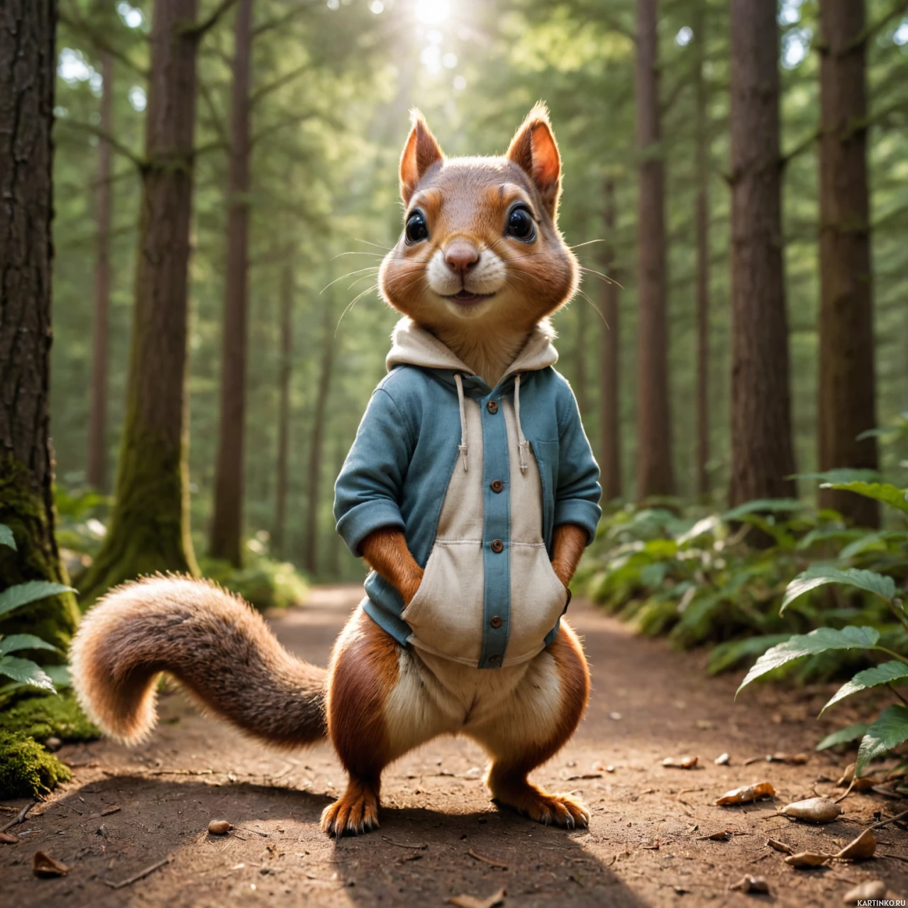 На картинке стоит мультяшный бурундук в лесу. На нем голубая куртка с двумя белыми карманами с каждой стороны. У него веселое выражение лица, и он стоит на задних лапах. Вокруг него высокие деревья, немного размытые, создавая ощущение глубины фона. В центре картинки пролегает грунтовая тропинка, словно приглашая зрителя войти в сцену.