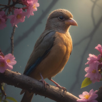 The image depicts a golden finch perched on a branch adorned with pink blossoms. The bird's feathers exhibit hues of blue, gold, and brown, suggesting a typical plumage for this species. The background features delicate branches laden with pink petals against a soft light that gives the scene a serene ambiance.