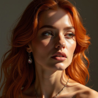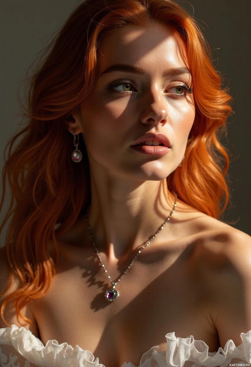 red hair and piercing green eyes, exuding an air of confidence and poise. Her skin is smooth and radiant, complemented by her well-