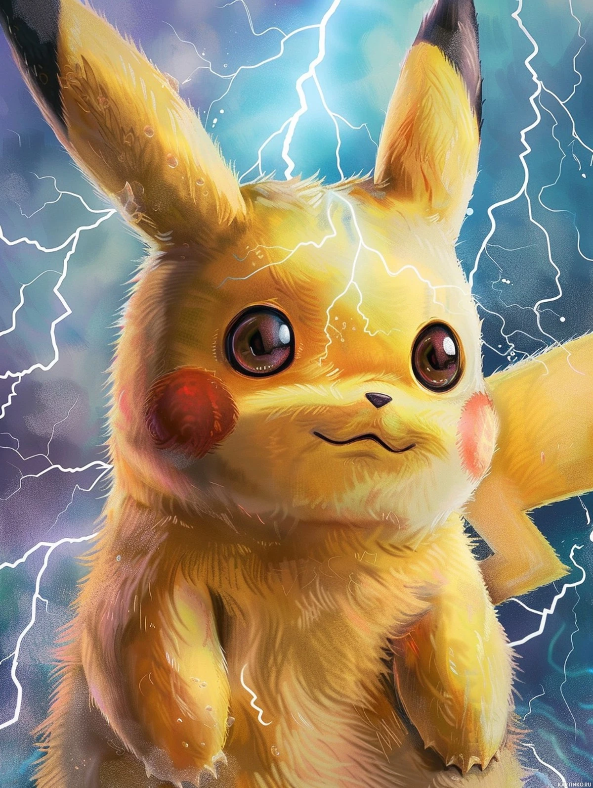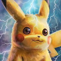 night sky with swirling clouds and what appears to be electric energy or sparks around Pikachu's head, suggesting its lightning-like ability called "Electric" that is commonly associated with Pikachu in the Pokémon series.