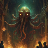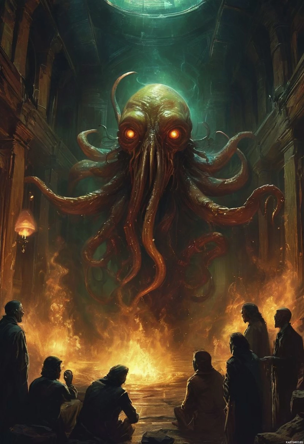 На картинке четверо людей сидят на земле у основания разрушенного аркового прохода. Арка украшена сложной резьбой и имеет два богато украшенных столба. Из арки вырывается огненный взрыв, освещающий сцену. Из этого взрыва появляется огромный монстр, похожий на осьминога, с раскинутыми щупальцами, словно принимая угрожающую позу. Тело существа имеет человеческую форму, но с головой осьминога и множеством глаз, что придает ему зловещий вид. Люди, похоже, смотрят вверх на монстра, их выражения лица скрыты. Место действия кажется древним.