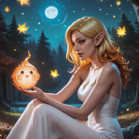 The image depicts a fantasy scene featuring an elf-like character with blonde hair, sitting on the ground under a night sky filled with stars and illuminated by moonlight. The elf is holding a glowing object that appears to be a lantern or candle, which emits light and warmth around it. The setting includes a forest background with trees and fallen leaves, enhancing the mystical atmosphere of the scene. The character's expression is contemplative, suggesting a moment of quiet reflection or perhaps magic-related activity.