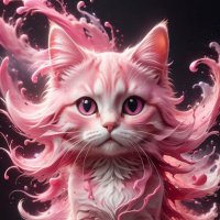 The image shows an illustrated cat with a fantastical appearance. It has long fur that appears to be in various colors, including shades of pink and purple. The cat's eyes are large and expressive, with one showing pink and the other blue. Around the cat is an ethereal, flowing energy or substance that gives the impression of a magical or dreamlike quality. This substance has a soft, pinkish hue and seems to emanate from the cat's body in a circular pattern, enveloping its surroundings.