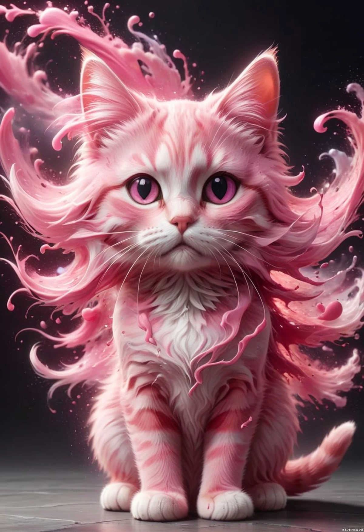 На картинке изображен сказочный кот с фантастическим обликом. У него длинная шерсть, переливающаяся множеством оттенков, включая розовый и пурпурный. Глаза кота большие и выразительные: один розовый, другой – голубой. Вокруг кота – нежная, струящаяся энергия, создающая ощущение волшебства и нереальности. Она имеет мягкий, розоватый оттенок и, кажется, исходит из тела кота, окутывая его со всех сторон.
