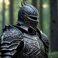 На картинке изображен персонаж в доспехах, напоминающих средневековые, с шипами на наплечниках и забралом на шлеме. Доспехи богато украшены и сделаны из металла, создавая впечатление костюма из исторического или фэнтезийного жанра. Человек стоит на фоне леса, за ним видны деревья. Освещение предполагает раннее утро или поздний вечер, судя по лучам солнца, пробивающимся сквозь листву над головой.