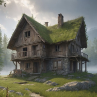 The image depicts a rustic, two-story wooden house with a thatched roof. The building has multiple windows and is topped with a chimney. It features a prominent front porch with railings and support columns. Surrounding the house are various outdoor elements such as rocks, plants, and a pathway leading up to the entrance of the house. The setting appears to be in a natural environment, possibly in the woods or near a forest, given the presence of trees in the background.