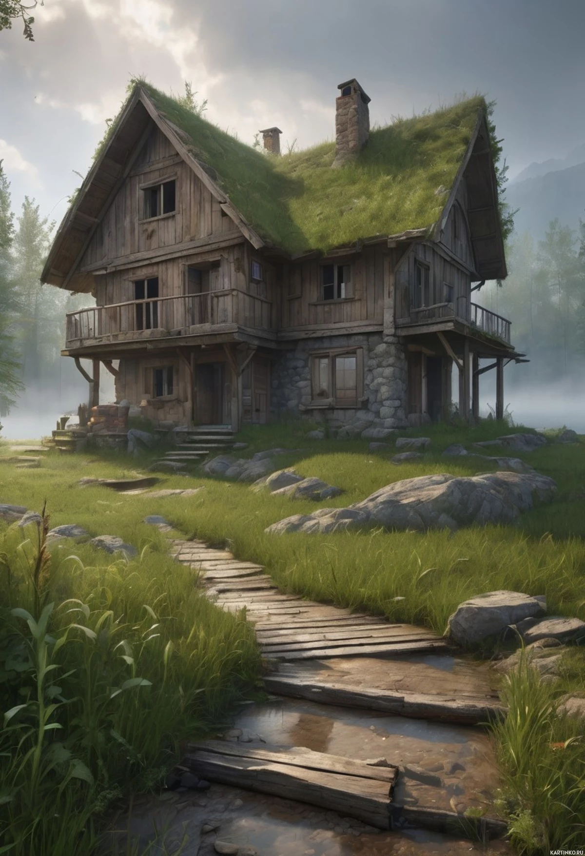 На картинке изображен старинный двухэтажный деревянный дом с соломенной крышей. Дом имеет множество окон и трубу. Выделяется просторная веранда с перилами и колоннами. Вокруг дома – камни, растения и дорожка, ведущая к его входу. Кажется, что дом стоит в естественном ландшафте, возможно, в лесу или рядом с ним, если судить по деревьям на заднем плане.