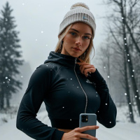 The image features a young female model outdoors during what appears to be winter due to the presence of snow. She is wearing a black top and has blonde hair. In her hands, she holds a smartphone and appears to be adjusting or looking at it. The background includes trees with leafless branches suggesting cold weather conditions.