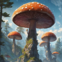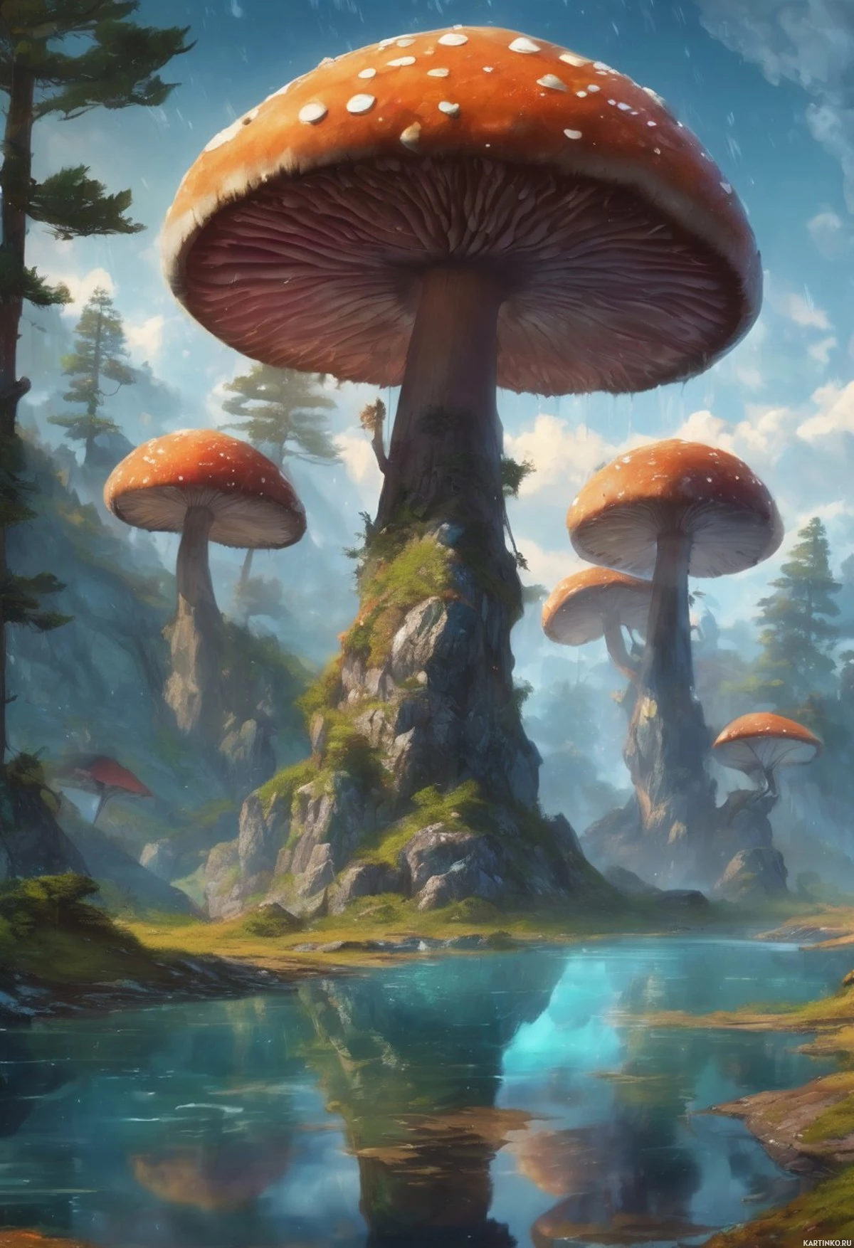 Картинка изображает фантастический пейзаж с грибами разных размеров. Крупные грибы выделяются на фоне чистого неба, на их шляпках видны точки. Перед самым большим грибом мерцает небольшой пруд, отражающий нижнюю сторону его шляпки. Вокруг грибов раскиданы более мелкие, на земле и у подножия скал. Ландшафт утопает в зелени, на заднем плане видны деревья под пасмурным небом. В сцене царит умиротворение, людей и признаков активности не видно.
