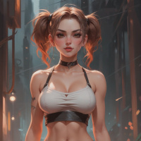 The image depicts a female character with red hair tied in pigtails on each side of her head, wearing a tank top and shorts that expose her stomach. She has accessories such as choker necklaces and wristbands, and her arms are crossed at the waist. The background suggests an urban environment with a streetlamp visible behind her.