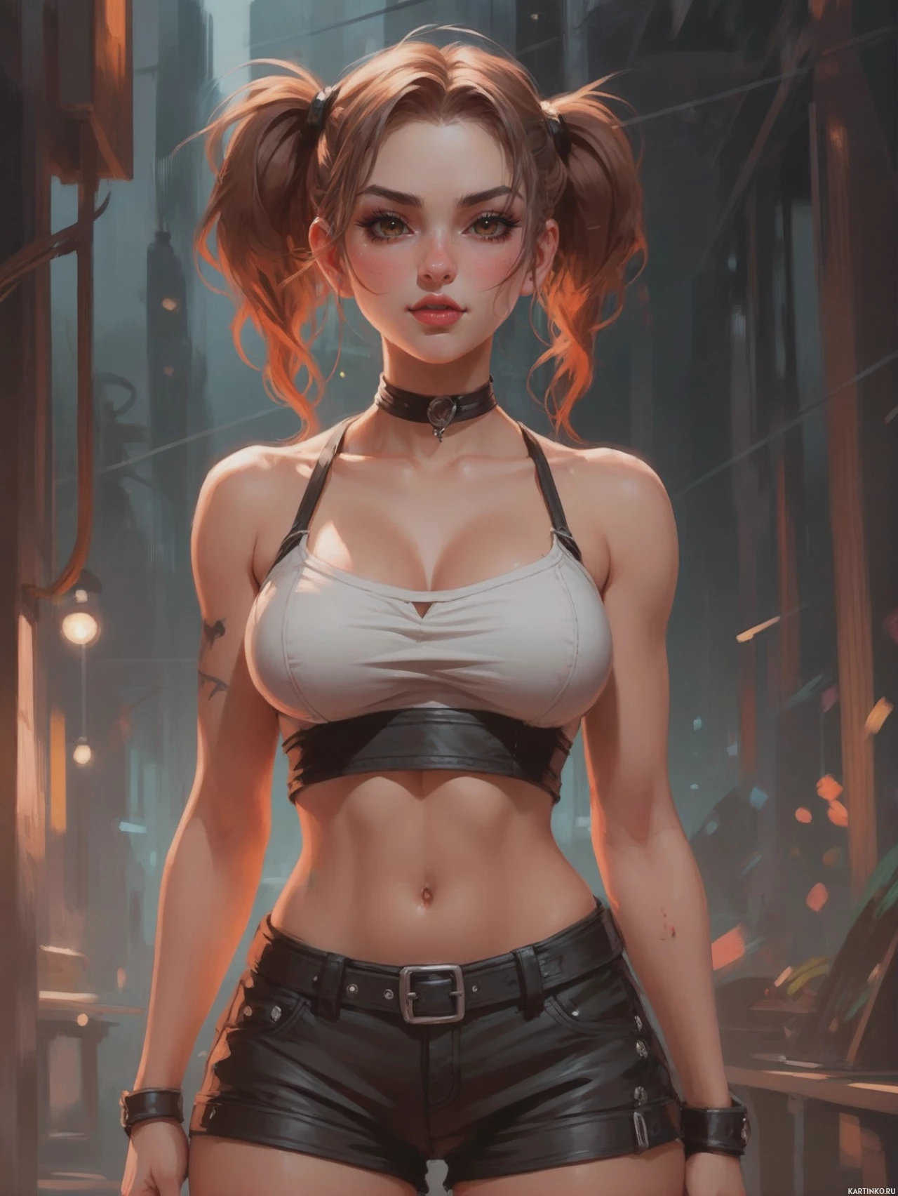 На картинке изображена девушка с рыжими косичками по бокам, в топе и шортах, открывающих живот. На ней чокеры и браслеты, руки скрещены на талии. На заднем плане – городской пейзаж, виден фонарь.