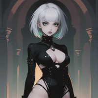 The image depicts a female character with white hair and a black outfit, standing in an archway. She has pointed ears on either side of her head, suggesting an elfin or fantasy-inspired design. Her attire includes high boots that reach the knee and intricate detailing, possibly indicating armor or leather. The setting appears to be indoors with dim lighting that highlights the character's face and upper body. There is a sense of mystery conveyed by her direct gaze into the viewer's perspective.