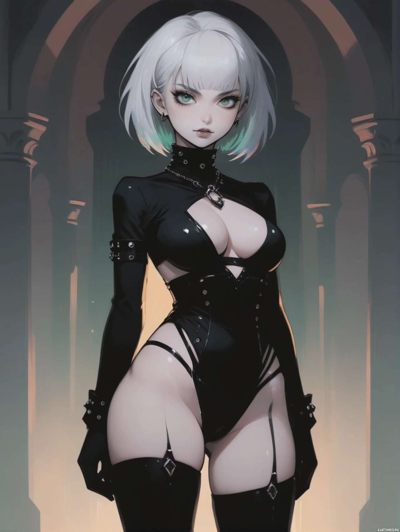 На картинке изображена девушка с белыми волосами и в черном наряде, стоящая в арке. У неё заостренные уши по обе стороны головы, что указывает на эльфийский или фэнтезийный дизайн. На ней высокие сапоги до колена и сложная отделка, возможно, элементы брони или кожаные вставки. Действие происходит в помещении, освещение приглушенное, оно подчёркивает лицо и верхнюю часть тела героини. В её пристальном взгляде чувствуется таинственность.