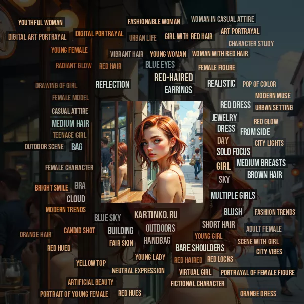 На картинке запечатлена молодая женщина с рыжими волосами до плеч и светлой кожей. Она смотрит в сторону с нейтральным выражением лица, ее взгляд следует за направлением объектива, а не ложится прямо на зрителя. На ее щеке заметен легкий контур, возможно, макияж или естественная черта, подчеркнутая солнечным светом. На ней топ оранжевого или персикового цвета без рукавов с тонкими бретельками и, кажется, кружевной отделкой у горловины. Фон предполагает городскую обстановку на открытом воздухе, вдалеке видны другие люди, вероятно, прохожие, на фоне ясного неба.