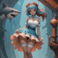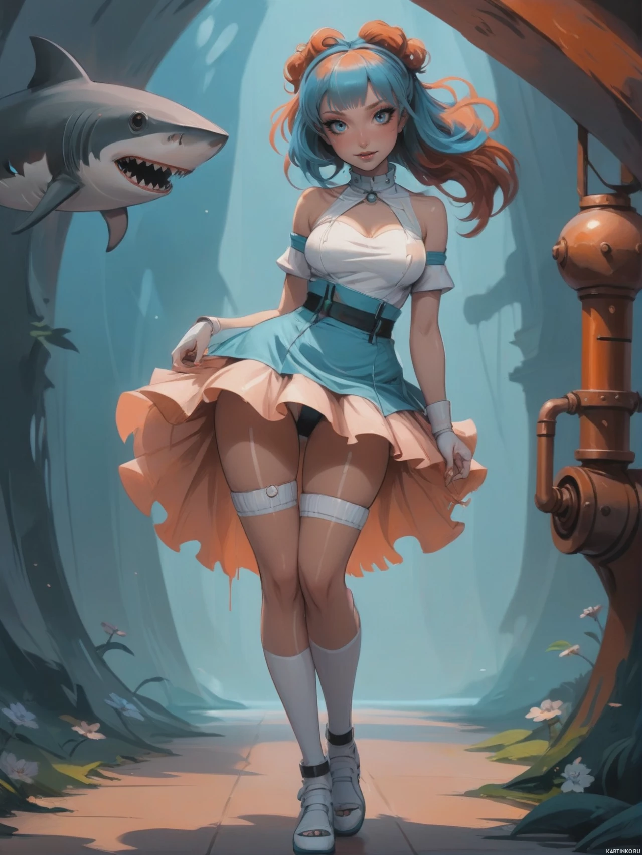 На картинке изобранена фантастическая сцена с девушкой в центре. Она выглядит как персонаж из мультфильма или иллюстрации, с характерными чертами в стиле японской анимации: большие выразительные глаза и яркие цвета волос. На ней юбка и что-то вроде доспехов или декоративной одежды, что указывает на сказочный сеттинг. Девушка взаимодействует с акулой, которая выныривает из воды рядом с ней. Рот акулы открыт, видны острые зубы, и кажется, что она смотрит на девушку. Вокруг – подводный пейзаж, скалы или кораллы, а у самого дна – водоросли или растения.