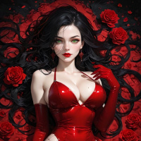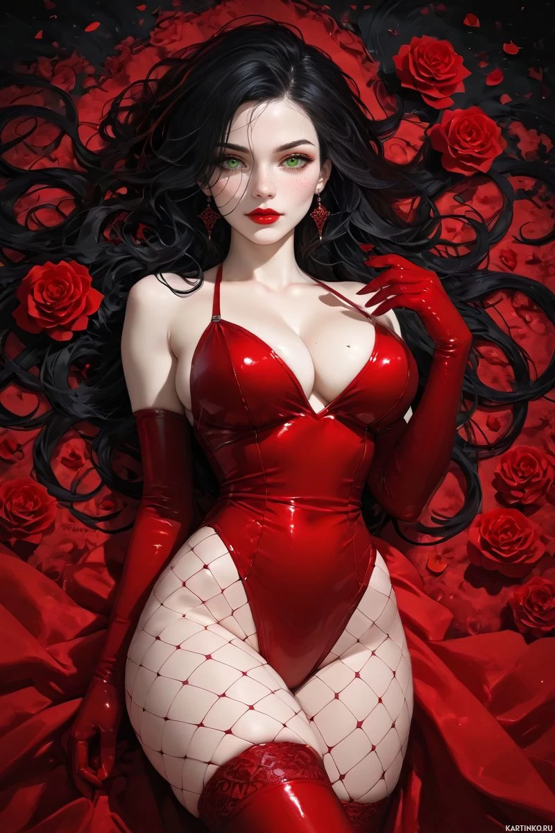 The image shows a character with dark hair depicted in a realistic style. She is wearing a red latex bodysuit and high-heeled boots, which are red and black in color. Her left hand rests on her hip, while her right hand holds what appears to be a rose. The background consists of a dark red gradient with a design that looks like falling petals or leaves around the character's head, creating an elegant and dramatic atmosphere. The character is reclining against a backdrop that resembles a flower, possibly roses given their shape and color.