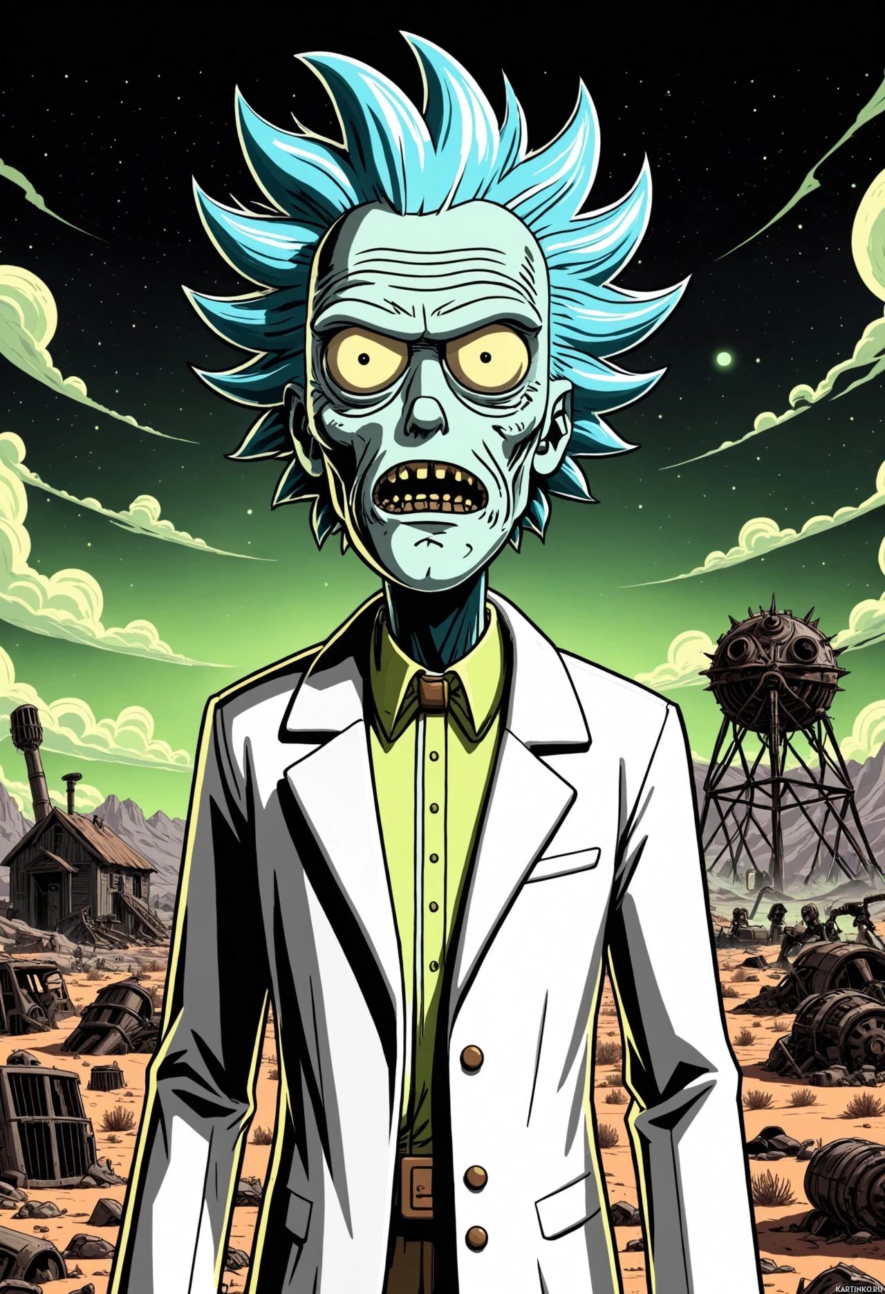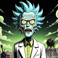 an animated character known as Rick Sanchez, a zombie depicted with a blue hairstyle. He is wearing a white lab coat and is standing on