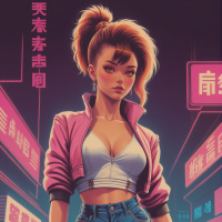 In the image, there is a female character depicted in a stylized and dynamic pose. She has red hair styled upwards with a ponytail on the right side of her head. Her attire includes a corset-style top with a lace or mesh design, visible cleavage, high-waisted blue jeans with distressed details, black boots, and she is also wearing fingerless gloves. The background suggests a futuristic setting with neon lights and a cityscape that could be interpreted as a nighttime scene within an urban environment.