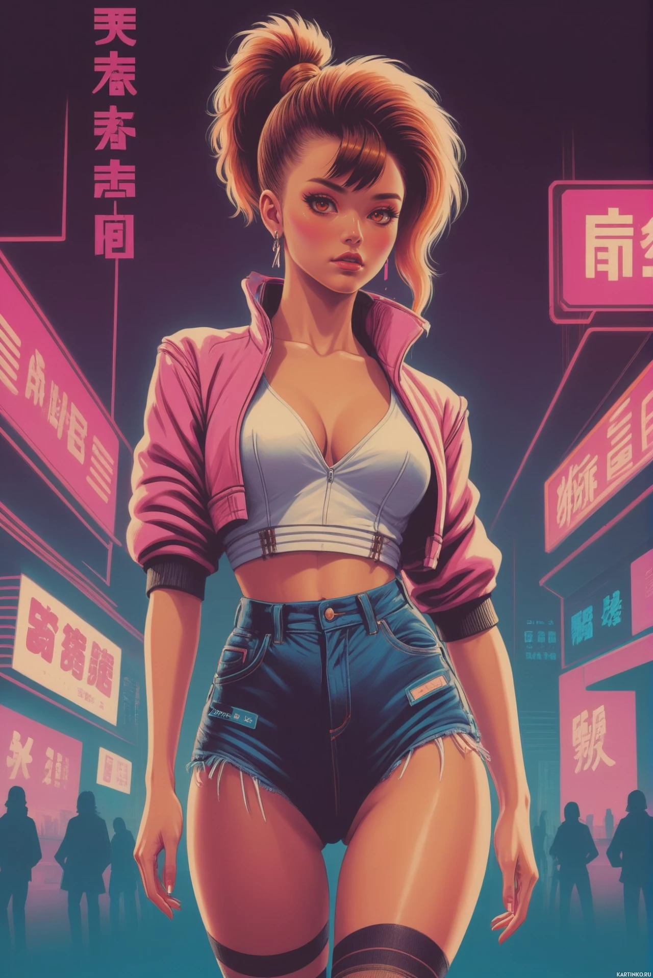 На картинке изображена девушка в стилизованной, динамичной позе. У неё рыжие волосы, уложенные вверх с хвостиком с правой стороны головы. На ней топ в стиле корсета с кружевной или сетчатой отделкой, видны участки декольте, джинсы с высокой талией и потертостями, черные ботинки, а также перчатки без пальцев. Фон указывает на футуристическую обстановку с неоновыми огнями и городским пейзажем, который можно интерпретировать как ночную сцену в городской среде.