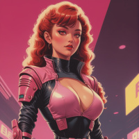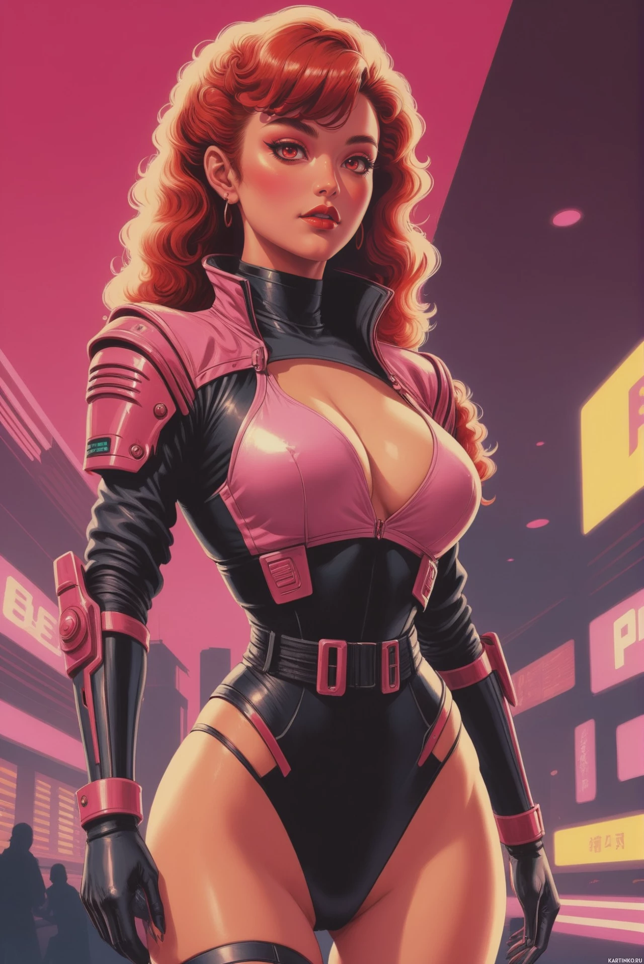The image features a stylized depiction of a female character with vibrant red hair styled in waves. She has fair skin and is wearing an armor-like outfit with pink accents, which includes a chest piece with a logo, gloves, boots, and a utility belt around her waist. The character is also wearing black thigh-high boots and is standing in a dynamic pose with one leg slightly bent at the knee. In the background, there are neon signs that suggest a futuristic or cyberpunk setting.