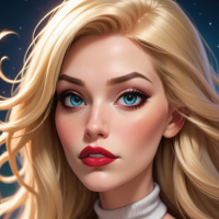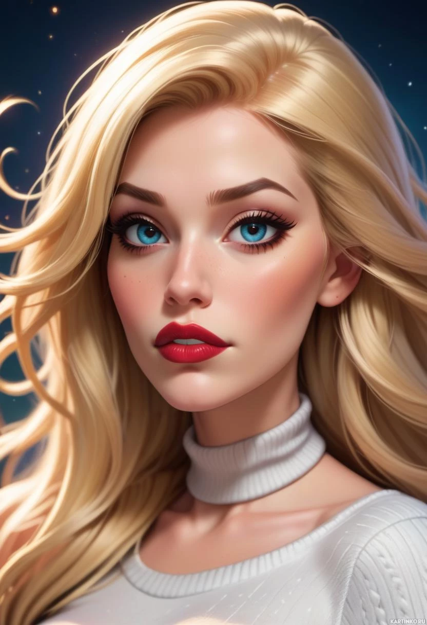 На картинке изображена девушка с золотистыми волосами, небрежно волнами спадающими на плечи. У неё большие, круглые голубые глаза с заметными ресницами. Кожа светлая, с лёгким сиянием. Губы красные, на щеках лёгкий макияж, придающий им лёгкий румянец. На носу и на щеках видны розоватые точки, напоминающие декоративные родинки. Она одета в белое платье с высоким воротником, выполненное в технике вязания, что соответствует современному стилю одежды.