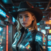 На картинке запечатлена женщина с светлыми волосами, идущая по улице, освещенной неоном, ночью. На ней черная кожаная куртка поверх серебристого комбинезона с элементами брони и накладками на плечи. Её наряд дополняет ковбойская шляпа с декоративным обрамлением. На заднем плане – городской пейзаж с подсвеченными вывесками и неоновыми огнями, указывающими на различные заведения.