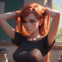 In the image, a young woman with vibrant red hair sits in front of a wooden desk covered with various objects, including books and what appears to be a small figurine. The woman is dressed in a black crop top paired with blue jeans, and her expression seems contemplative. She rests her hand on her head, perhaps deep in thought or simply enjoying the quiet moment. The desk and its contents suggest a workspace, possibly an office or study room.
