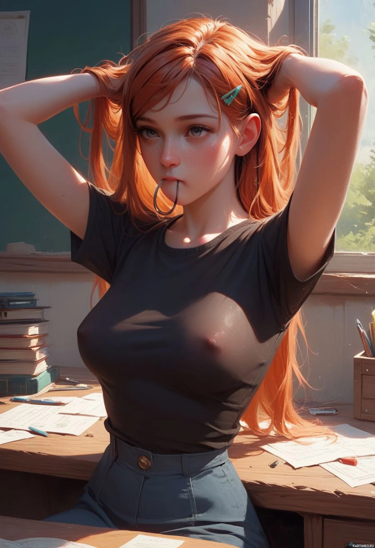 На картинке молодая женщина с яркими рыжими волосами сидит за деревянным столом, заваленным разными предметами, среди которых книги и, кажется, небольшая статуэтка. На ней чёрный топ и синие джинсы, а выражение лица задумчивое. Она опирается рукой на голову, возможно, погружена в раздумья или просто наслаждается тихим моментом. Стол и его содержимое указывают на рабочее пространство, возможно, кабинет или рабочий уголок.