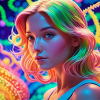 In the image, a girl with pink hair is depicted. She is set against a vibrant and fantastical background featuring colorful octopuses and other sea creatures. The girl has a neutral expression on her face and is looking directly at the viewer.