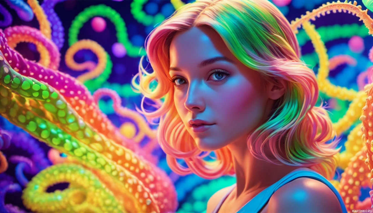 На картинке изображена девушка с розовыми волосами. На заднем плане – яркий и сказочный фон с разноцветными осьминогами и другими морскими обитателями. У девушки спокойное выражение лица, и она смотрит прямо на зрителя.