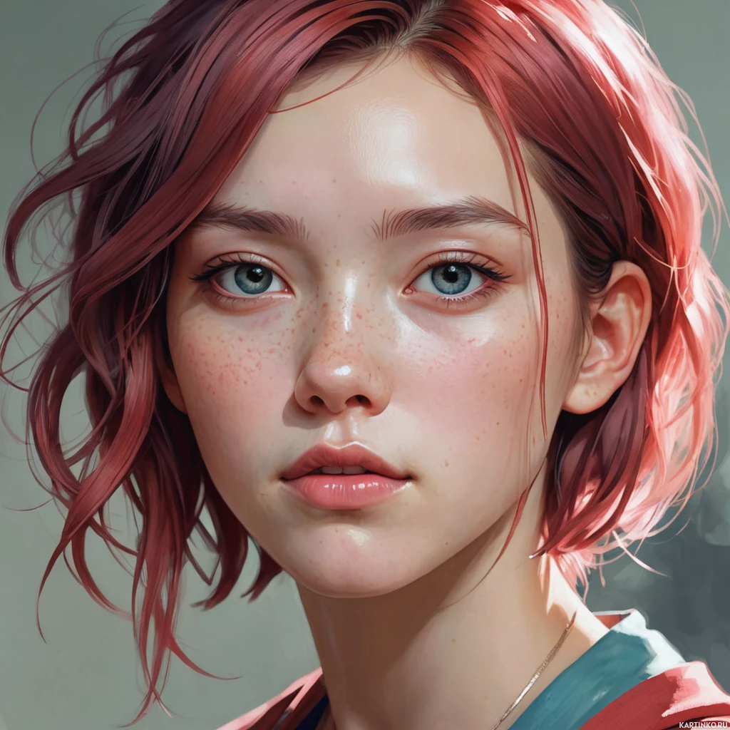 На картинке изображена девушка с рыжими волосами, уложенными в короткие волнистые слои. У неё лёгкий розовый румянец на щеках, чётко подчёркнутые глаза и нейтральное выражение лица, направленное прямо на зрителя. У неё голубые глаза, и на шее видно, кажется, ожерелье. Это цифровая графика или иллюстрация, а не фотография реального человека.