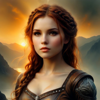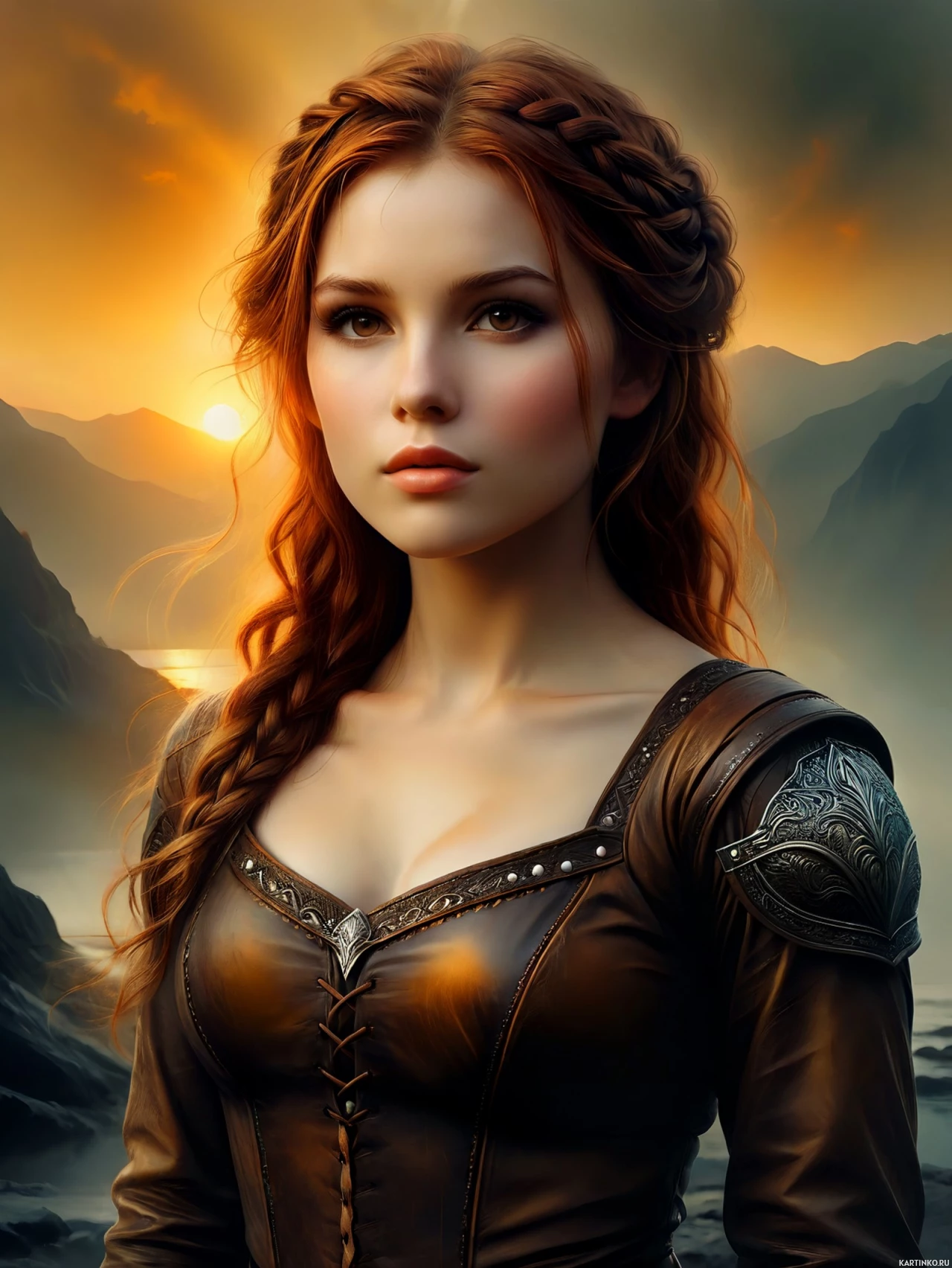 На картинке изображена девушка с длинными рыжими волосами. На ней доспехи, намекающие на средневековье или мир фэнтези – кожаная нагрудник и, возможно, шлем. Под доспехами виднеется платье с высоким воротником. На заднем плане – каменистая местность и заснеженные горы вдалеке, освещенные, вероятно, восходом или закатом солнца, что создает мягкий свет на ее лице.