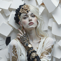 The image shows a woman with light skin and blonde hair styled in an updo. She has striking makeup, including darkened eyeshadow and what appears to be a tear or liquid on her cheek, enhancing a dramatic look. Her expression is neutral. She is wearing elaborate jewelry and accessories. On one hand, she's adorned with multiple bangles that catch the light, while the other hand holds what looks like black feathers or a fabric item with black detailing. Around her neck is a dark, possibly velvet or silk, collar featuring intricate embroidery or beading in shades of gold and black. Her attire includes a sleeveless dress with textured fabric that could be resembling ancient Roman clothing, with a high neckline and a draped style. The dress is a blend of white and what might be gold, suggesting luxury or historical significance. The background consists of multiple panels in varying shades of cream, providing an artistic backdrop that contrasts with the woman's striking appearance. The overall style of the photograph appears to blend elements of classical elegance with modern fashion and artistic expression.