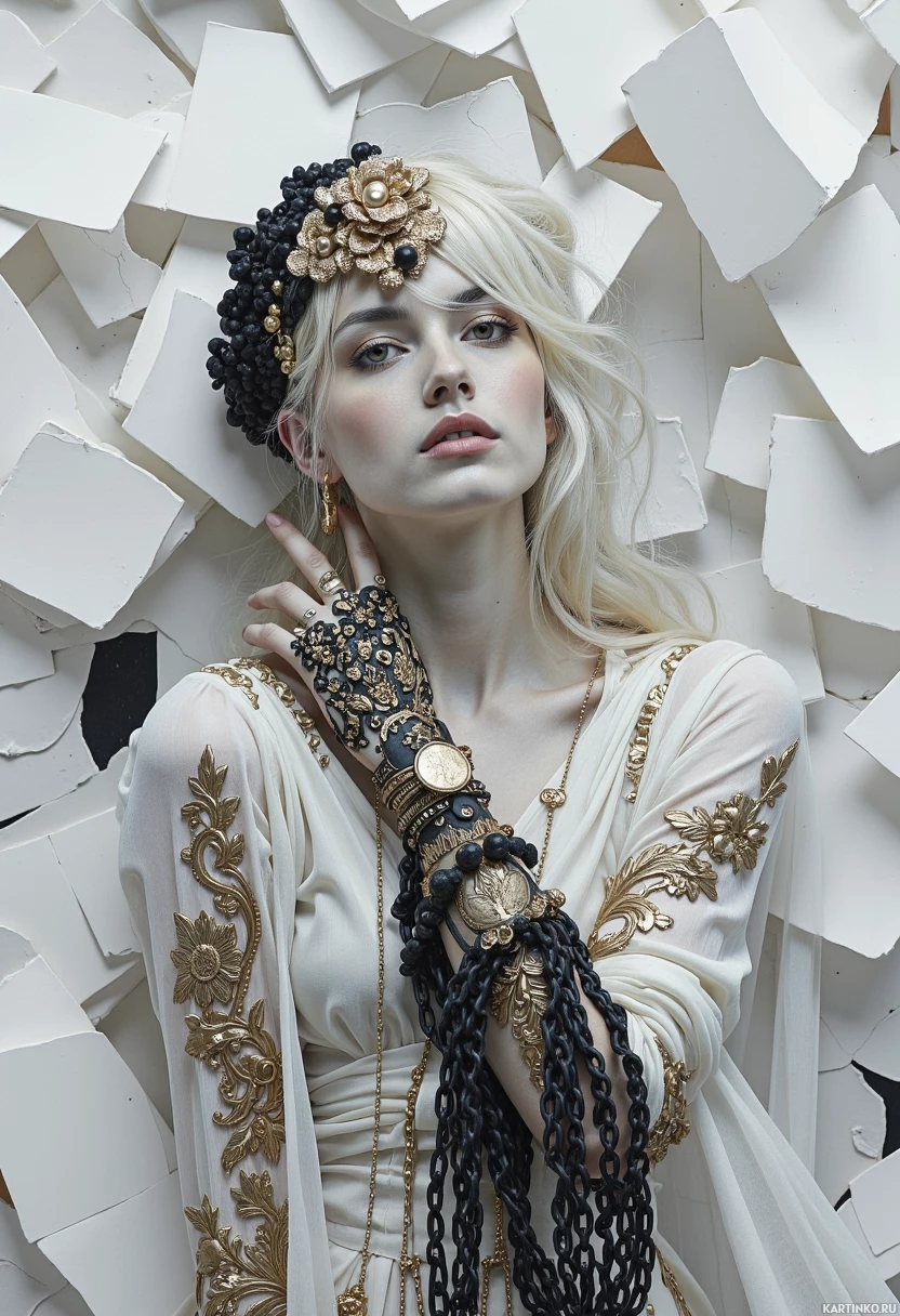 На картинке изображена женщина со светлой кожей и светлыми волосами, уложенными в пучок. У нее яркий макияж, включая темные тени и, кажется, слеза или капля на щеке, что добавляет драматизма. Выражение лица нейтральное. На ней – изысканные украшения и аксессуары. На одной руке – несколько браслетов, которые ловят свет, а в другой руке – что-то похожее на черные перья или ткань с черной отделкой. Вокруг шеи – темный воротник, возможно, из бархата или шелка, с замысловатой вышивкой или бисером в золотых и черных тонах. Ее наряд включает в себя платье без рукавов из фактурной ткани, напоминающей древнеримскую одежду, с высоким вырезом и драпированным силуэтом. Платье сочетает в себе белый цвет и, возможно, золото, что намекает на роскошь или историческое значение. На заднем плане – несколько панелей разных оттенков кремового цвета, создающих художественный фон, который контрастирует с яркой внешностью женщины. Общий стиль фотографии, кажется, сочетает в себе элементы классической элегантности с современной модой и художественным самовыражением.