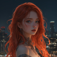 In the image, a girl with vibrant red hair is standing in what appears to be an urban setting at night. She has striking blue eyes and a serious expression on her face. Her attire consists of a black top hat adorned with intricate designs, paired with a necklace that adds to her unique look. The cityscape around her includes buildings with recognizable skylines, suggesting a location possibly inspired by New York City. The overall composition of the image gives it an artistic and moody atmosphere.