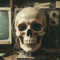 На картинке изображен череп в наушниках, стоящий на столе, окруженном различным электронным оборудованием. На заднем плане – книги и другие предметы, что говорит о том, что это может быть рабочее место или студия.