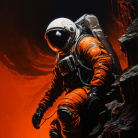 На картинке запечатлен астронавт, склонившийся на фоне пейзажа, похожего на вулканический или связанного с огнем. На нем белый скафандр и шлем, характерные для экипировки космонавтов, но окружающая обстановка не соответствует обычной космической среде. На заднем плане видны потоки лавы или расплавленная порода, указывающие на экстремально высокие температуры. Цвета на картинке очень контрастные: нижнюю часть доминируют красные и черные тона, а скафандр астронавта выделяется на их фоне.