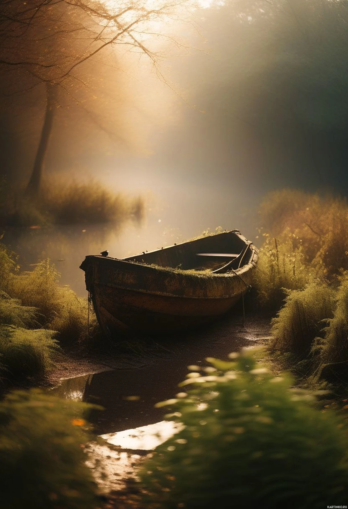Загадочный туманный пруд с пустой лодкой Картинки с такими же тегами