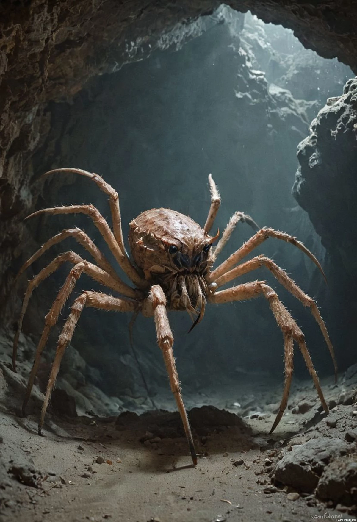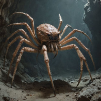 a fantasy scene featuring a monstrous creature. This creature has an arachnid form with six legs and is adorned in blue and red. It's positioned in the center of the frame, standing on