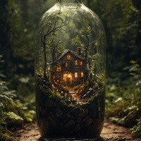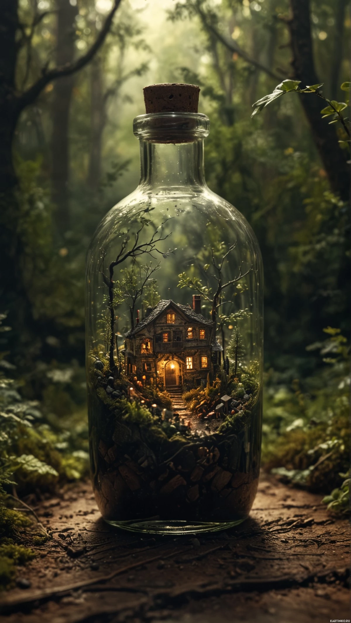 Картинка изображает фантастическую сцену с флаконом, на поверхности которого – миниатюрный лес. Внутри флакона – освещенный домик с дымом, выходящим из трубы, и зажженными свечами в окнах. Вокруг домика – деревья и мох, создающие ощущение пышной зелени, вероятно, изображающей чащу леса. Флакон стоит на земле среди природного мусора, что может говорить о его давнем нахождении там. Стиль картинки – реалистичный, с волшебным и сказочным оттенком, характерным для иллюстраций на фэнтези-тематику.
