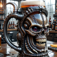The image depicts a large mug with a skull design on it. The skull features a purple glowing eye, and there are mechanical elements integrated into the design, suggesting a futuristic or cybernetic theme. The mug is placed in what appears to be a bar or kitchen setting, as indicated by bottles and other items in the background that suggest a beverage serving environment. There is steam rising from the top of the mug, adding a dynamic element to the scene.