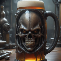 The image features a large mug that has been designed to resemble a skull with an illuminated red glow emanating from the eye sockets and mouth area, giving it a demonic or fierce appearance. The skull design is detailed, with sharp teeth and deep shadows creating a sense of menace. The mug is filled with a liquid that appears to be beer or ale, based on its golden-amber color, which is consistent with typical brews. In the background, there are several mechanical objects that have a gritty, industrial look to them, suggesting a setting that could be a workshop or laboratory. The floor seems to be made of wooden planks, and there are various tools scattered around, contributing to the sense of an active and busy environment.