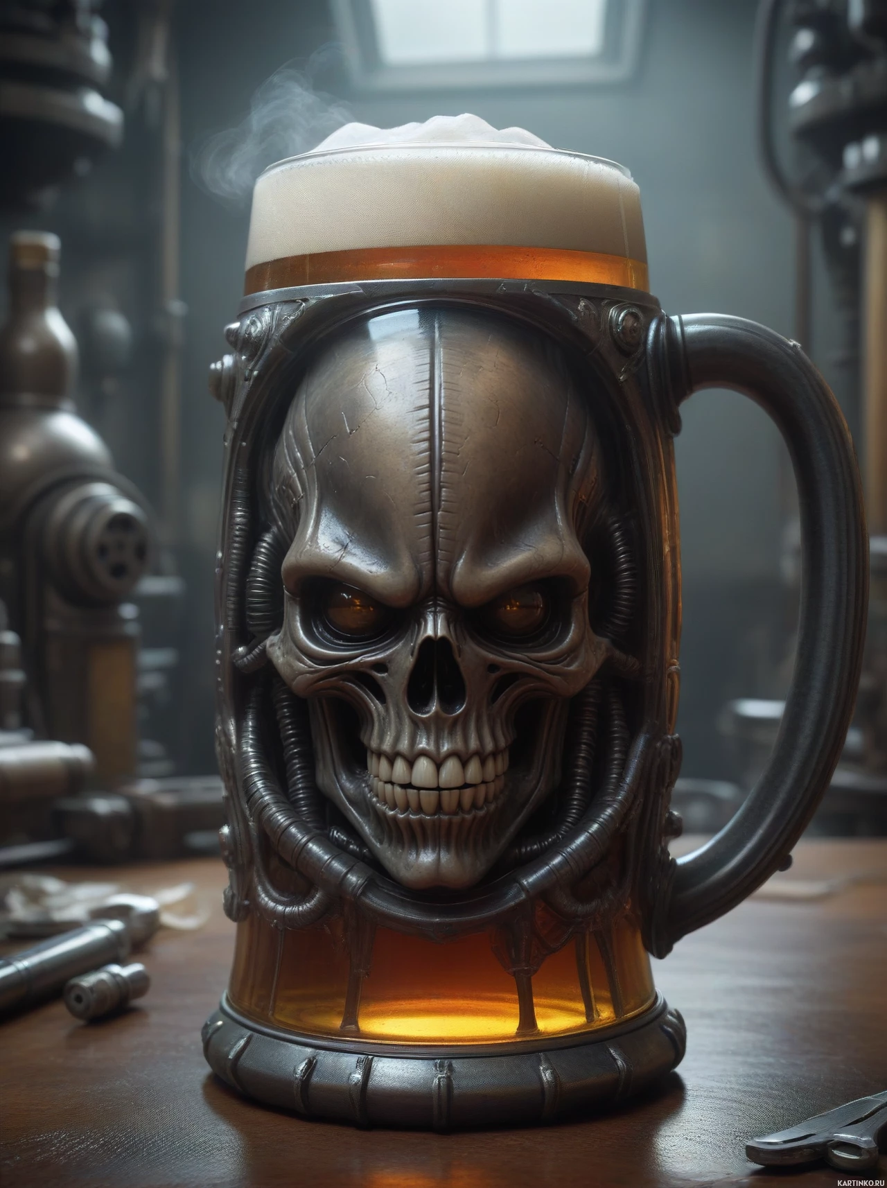 На картинке изображена большая кружка, стилизованная под череп с красным свечением, исходящим из глазниц и области рта, что придает ей демонический или свирепый вид. Дизайн черепа детализирован, с острыми зубами и глубокими тенями, создающими ощущение угрозы. Кружка наполнена жидкостью янтарного цвета, похожей на пиво или эль. На заднем плане видны различные механические предметы с грубым, индустриальным видом, указывающие на обстановку, напоминающую мастерскую или лабораторию. Пол сделан из деревянных досок, а повсюду разбросаны инструменты, создающие ощущение оживленной и рабочей среды.