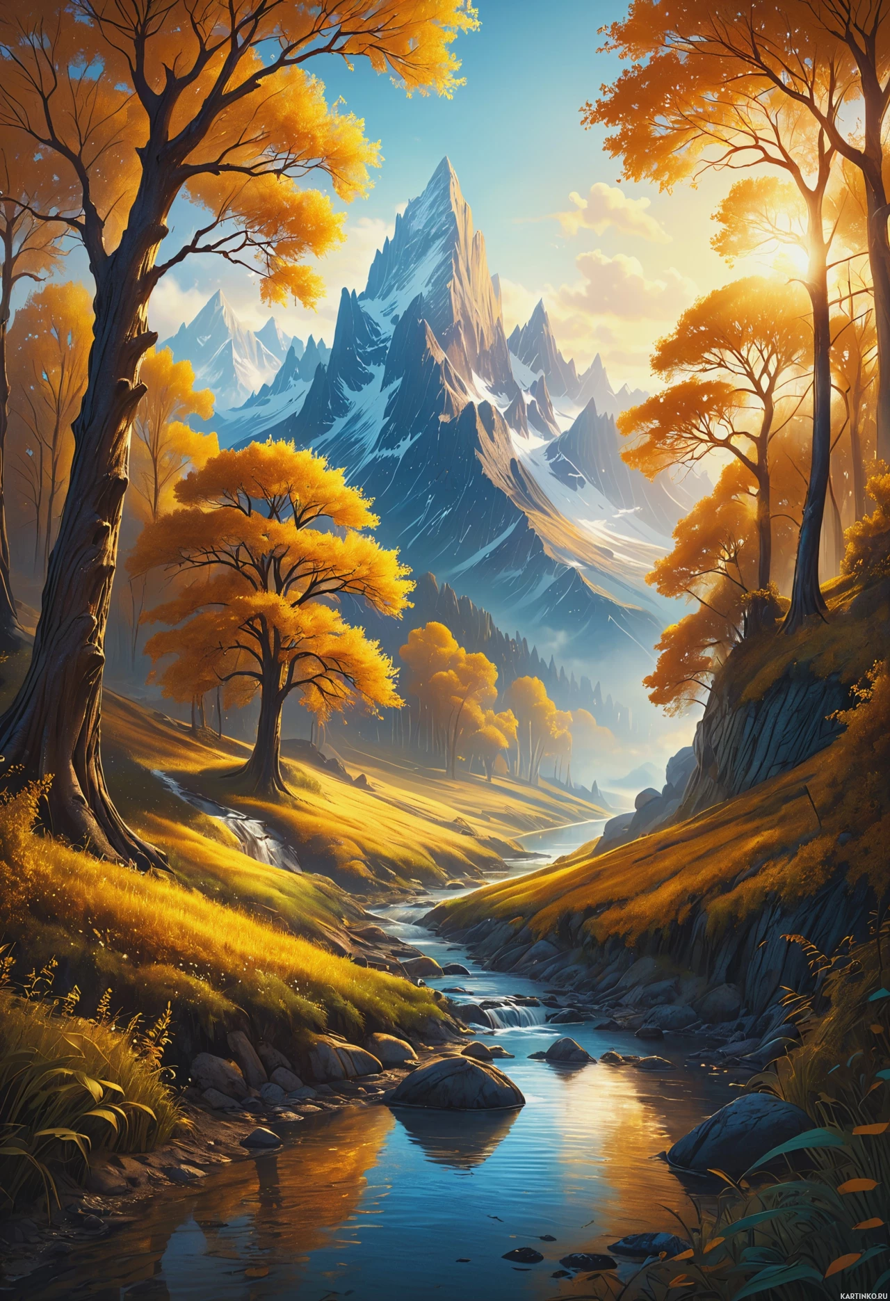 Картинка изображает спокойную осеннюю рощу. Река мягко струится через центр композиции, отражая окружающие цвета в своей глади. По обе стороны реки – яркие деревья с красными листьями и желтой листвой, указывающие на наступление осени. Эти деревья обрамляют картинку с обеих сторон. На заднем плане, возвышаясь над всем, простирается величественная горная цепь, освещенная, кажется, ярким солнцем. Вершины гор покрыты снегом, создавая контраст с теплыми осенними красками переднего плана. Небо над головой ясное и голубое, с редкими облаками, разбросанными по нему.