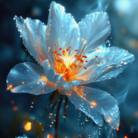 Картинка показывает яркую цифровую иллюстрацию одинокого синего цветка с желтыми и оранжевыми оттенками в центре, на фоне темного ночного неба, усыпанного звездами. У цветка множество слоев лепестков и тычинок, что говорит о его полном расцвете. На поверхности цветка видны маленькие капельки воды или росы, намекающие на то, что его недавно полили или прошел дождь. Слева в картинке изображен стебель с небольшими листьями, что подтверждает, что это растение, а не парящий объект. Общая атмосфера картинки – нежная и безмятежная, что подчеркивается светящимися искрами в небе и мягким светом, падающим на цветок.