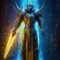 Картинка изображает персонажа в стиле фэнтези, стоящего в том, что похоже на подземный храм или пещеру. На нём доспехи, украшенные сочетанием синих и золотых элементов, что намекает на высокий статус или власть в этом мире. Он держит посох с светящимся навершием, излучающим свет, который контрастирует с тёмной обстановкой вокруг. За его спиной – драматичное небо с молниями, словно подчеркивающими атмосферу мощи и напряжения. Архитектура окружающей области с каменными арками и колоннами усиливает ощущение таинственного или древнего места.